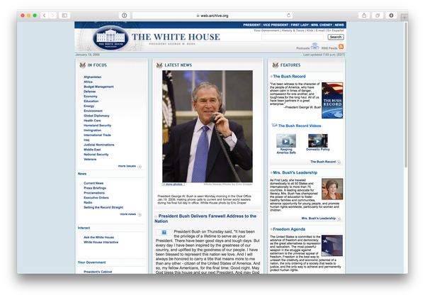 以下為白宮官網在2009年1月19日的樣子。當時,小布什還是美國總統。自奧巴馬上臺之后,白宮的網站就經歷了一次大改版,并且看起來還會繼續下去。