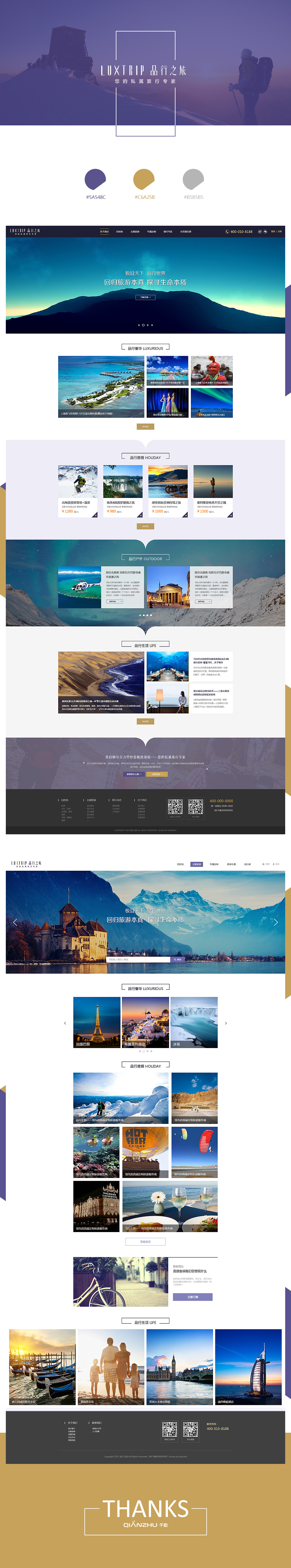 下圖的設計欣賞中,第一版采用高端透明質感黑色,配以紫色凸顯高端旅游的特點;第二版則采用了更為干凈、清新的白色;兩版風格各異,各有特點。設計師在細節設計和配圖上也花了心思,體現了精細化設計。本作品的內頁細節也很精彩,高端、清新并重的同時,也不乏人性化,訪客可以體驗一下。